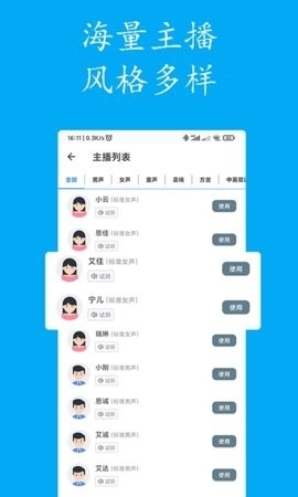 拥有不同的主播声音,不仅包含普通话、还支持粤语、四川话、东北话、台湾话等多种方言、甚至支持英语配音。满足你极大的需求。