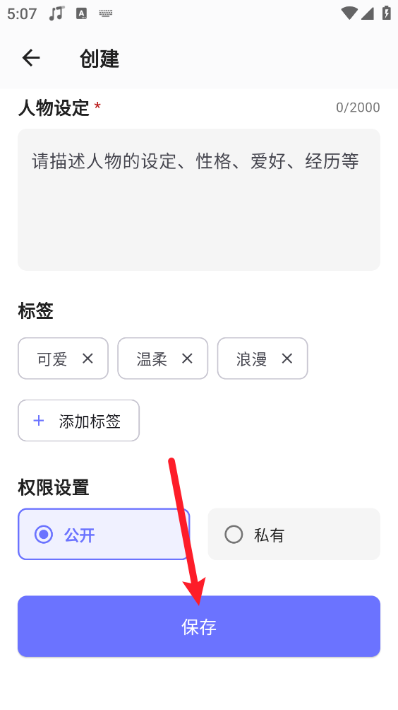 5、接着下滑对人物进行设置,输入标签后,选择权限设置,最后点击“保存”即可。