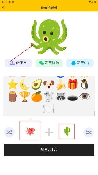 2、在合成页面中挑选两个目标Emoji元素(例如章鱼、仙人掌),就能生成经过组合的全新形象。