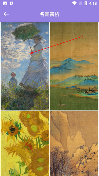 3、进入【名画赏析】页面后,可浏览多种风格的经典画作(例如印象派、传统山水类作品等),点击相应画作即可进入详情页查看具体细节。