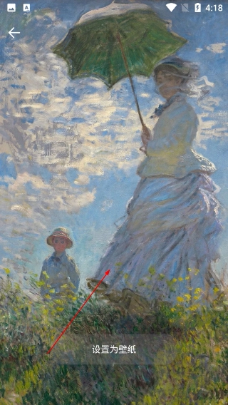 4、进入单幅名画的详情页面后,能够查看作品的细节内容,点击页面上的【设置为壁纸】功能按钮,就可以把这幅画作设置成设备的壁纸。