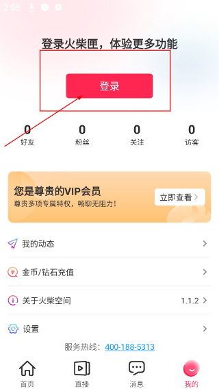 2、进入“我的”页面后,点击【登录】按钮,即可进入火柴空间的登录操作界面,该页面还展示了VIP会员等相关信息。