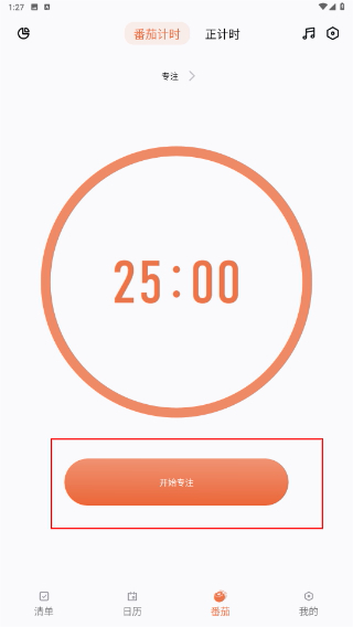 4、进入番茄钟界面,点击“开始专注”按钮,启动25分钟的专注计时功能。