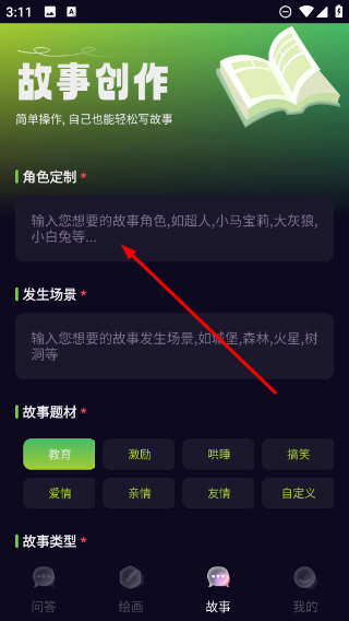 2、进入【故事创作】页面后,先在【角色定制】栏目中输入故事角色,接着填写【发生场景】等需要必填的项目。