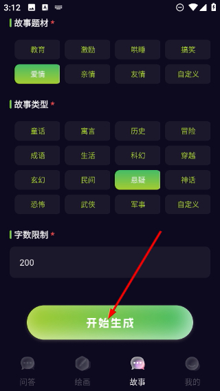 3、选定【故事题材】和【故事类型】,并设置好【字数限制】后,点击【开始生成】按钮即可启动故事创作流程。