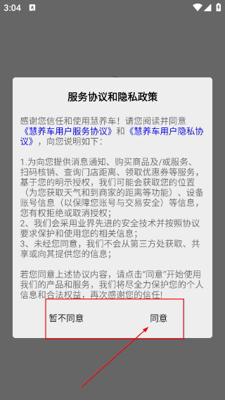 1、进入【慧养车】后,请先仔细阅读【服务协议和隐私政策】,在充分了解信息获取、安全保障等相关条款内容后,点击【同意】按钮,即可继续使用平台提供的各项服务。