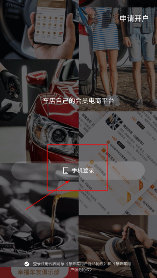 2、在【慧养车】的申请开户页面(该页面属于车店会员电商平台),找到并点击【手机登录】按钮,就能跳转至登录界面完成账号登录操作。