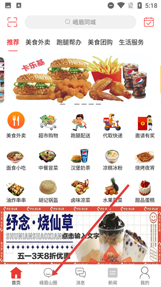 点击底部的【峨眉山圈】选项,就能进入对应的社区板块页面,在那里可以浏览各类本地生活相关的功能入口。