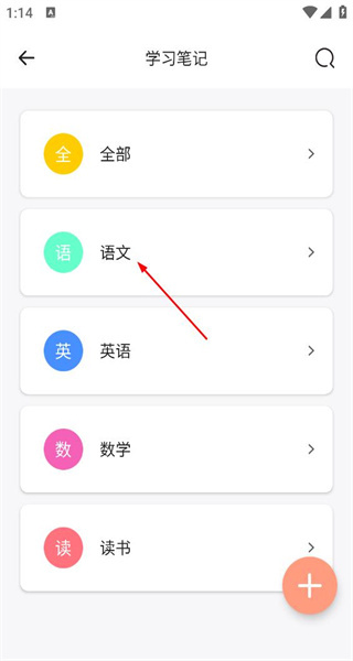 在学习笔记页面,浏览各类学科分类,选择语文分类,点击进入对应学科笔记界面。