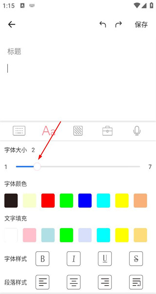 进入新建笔记的编辑界面后,能够对字体的大小、颜色等格式进行设置,接着在标题栏和内容区域分别填写对应的笔记内容。