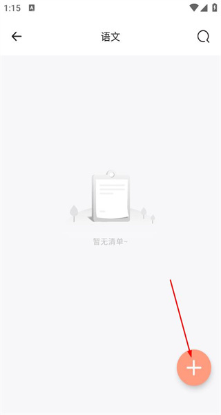 进入语文笔记界面后,看到“暂无清单”的提示,随即点击页面上的加号按钮,准备创建新的笔记。