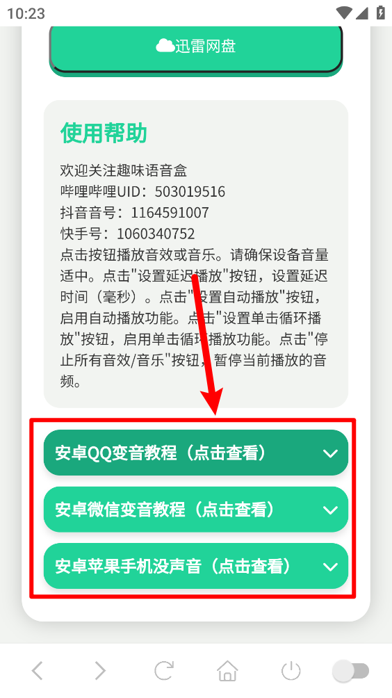 最后滑动至最底部,就能查看将变声应用到社交平台的教程。