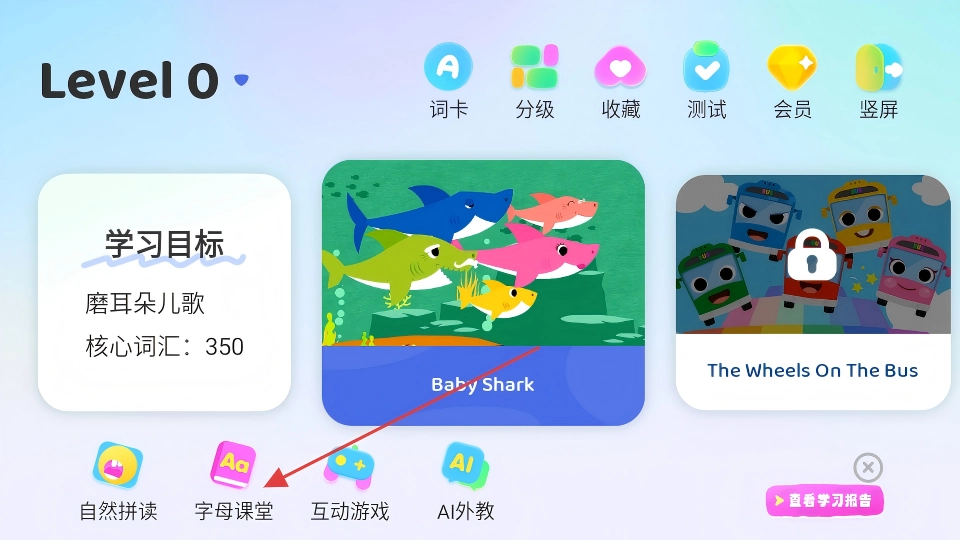 在Level-0界面,点击【字母课堂】选项,即可进入单词学习页面。