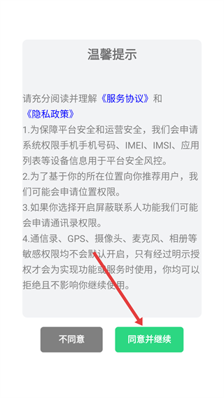 在仔细阅读《服务协议》与《隐私政策》的相关条款后,点击【同意并继续】按钮,即可进入应用的功能操作界面。