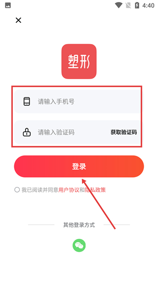 在【塑形】登录页面,用户可以选择【微信快捷登录】或者【手机号登录】这两种方式,不过需要先勾选相关协议,登录操作才能被激活。