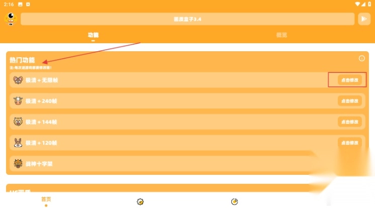 2、在【热门功能】板块里,找到【极清 + 无限帧】选项,点击它后面的【修改】按钮。