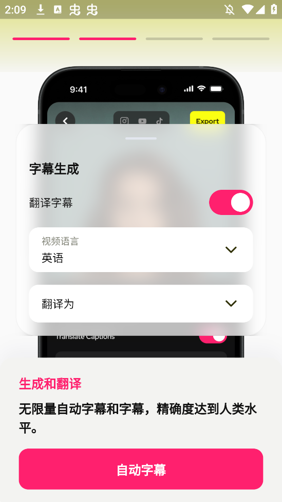 Subcap是一款实用性很强的视频字幕翻译工具,既支持现场拍摄视频,也可从手机相册上传已有的视频。这款安卓版软件能自动识别视频中的音频内容,将其转换为可编辑或复制的文字字幕。此外,它还具备自动翻译功能,能把视频原语言的字幕转换成其他语言,并且可以在同一个视频中同时添加两种不同语言的字幕。