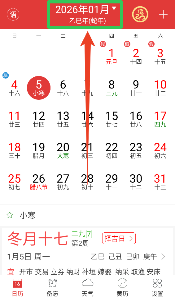 3、如图所示,会自动跳转到日历页面,日历中标红色圆圈的日期的哦朴实吉日。