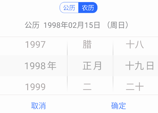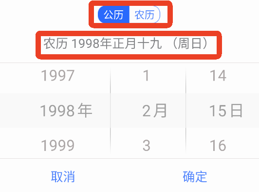 2、点击公历后,选择对应的生日,上方的农历就会显示对应日期的农历日期。