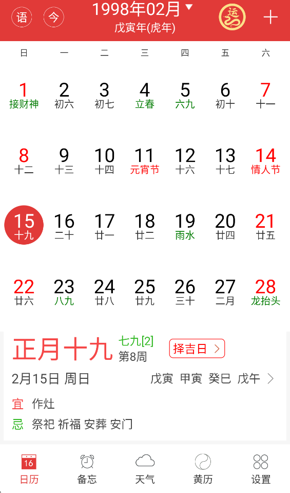 3、除了传统的日历功能,老黄历还提供实时天气信息和多种免费占卜服务,包括八字排盘等,助你探寻玄学命运的奥秘。