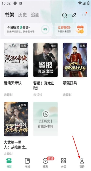 打开软件后,能在书架浏览推荐的书籍,点击底部的“我的”选项,即可进入个人相关页面。