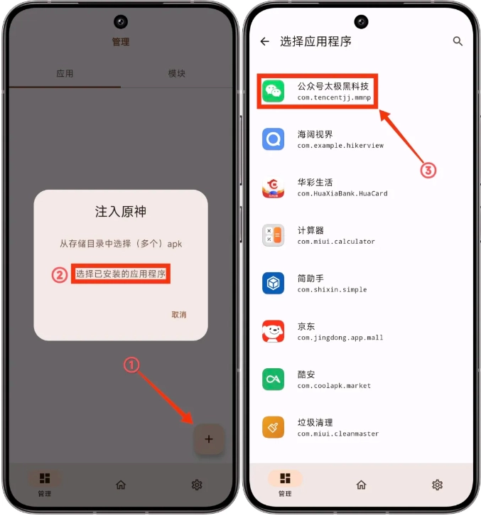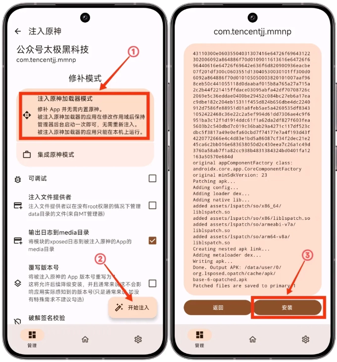 请注意:因为签名存在差异,在安装经过注入处理的应用之前,需要先把原来的应用卸载掉。卸载之前,请一定要提前将应用数据和聊天记录备份好。