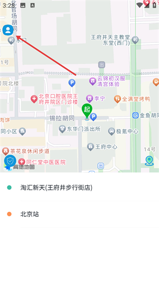 在地图界面定位到目标区域后,能够查看周边的地点,像【北京口腔医院王府井院区门诊楼】这类场所都能显示出来,从而帮助用户规划出行路线。