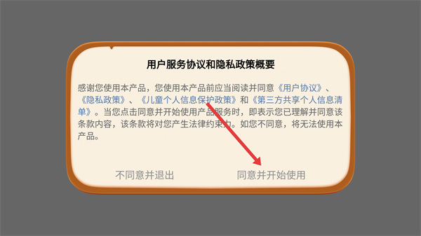 请先阅读《用户协议》《隐私政策》《儿童个人信息保护政策》等相关条款,随后点击“同意并开始使用”按钮,即可进入产品后续操作流程。