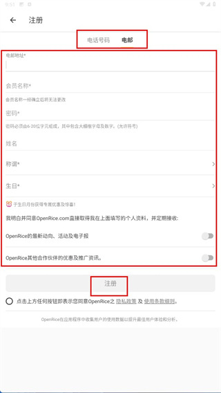 注册【OpenRice】时,需选择【电话号码】或【电邮】作为注册方式,填写相关表单信息后,点击【注册】按钮即可完成账号创建。