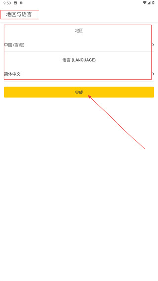 进入应用后,请先选择【地区】和【语言(LANGUAGE)】,确认设置无误后,点击黄色的【完成】按钮即可继续操作。