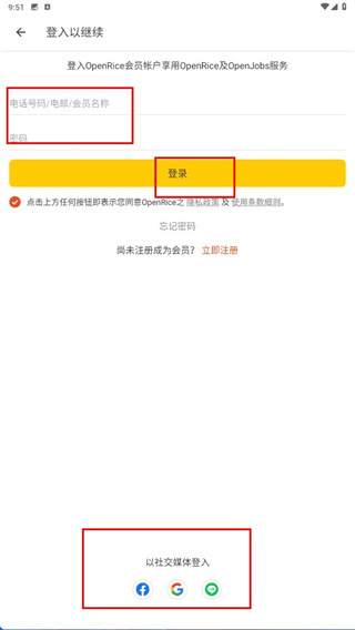 登录【OpenRice】时,你可以输入【电话号码、电邮或会员名称】以及【密码】后点击【登录】按钮,此外也能选择通过社交媒体账号进行登录。
