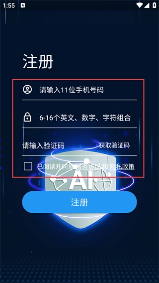 在注册页面完成信息填写:输入11位手机号码,点击【获取验证码】并填写收到的验证码,点击【注册】完成账号注册。