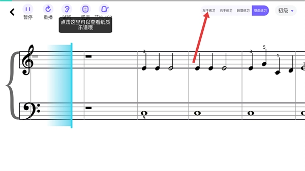 进入乐谱界面后,点击顶部的【左手练习】选项,即可切换到左手单独练习的模式。