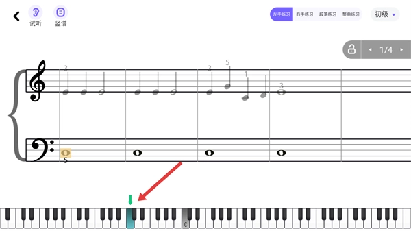 在练习界面里,跟着钢琴键盘上的绿色提示区域,按照乐谱的节奏按下对应的按键。