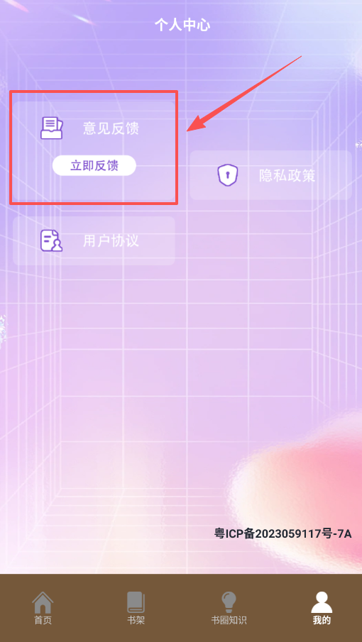 四、所有个性化管理与设置功能均集中在“我的”页面。用户可在此进入个人中心,完成意见反馈提交、隐私政策查阅等相关操作。