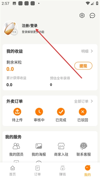 进入个人中心后,你可以查看【我的收益】和【外卖订单】的状态,点击【注册/登录】按钮能够解锁更多功能,同时也可以使用【我的服务】板块下的相关工具。