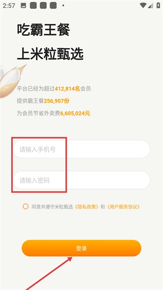 在登录界面,要填写【请输入手机号码】【请输入登录密码】,勾选相关协议后点击【登录】按钮,就能进入平台体验霸王餐等服务。