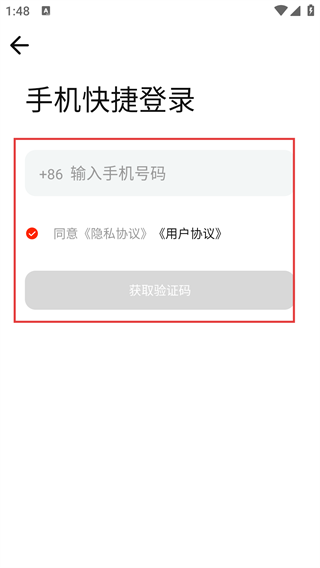 进入手机快捷登录页面后,在显示“+86-输入手机号码”的输入框中填写你的手机号码,接着点击“获取验证码”按钮即可。
