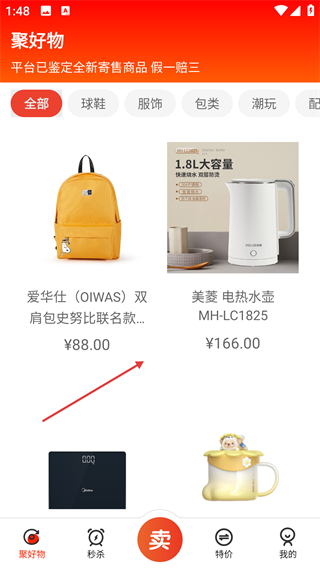 进入【聚好物】页面后,能够借助【球鞋】【服饰】等分类进行选品操作,还可以通过底部导航栏来切换不同的功能模块。