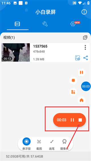 录制的时候,你可以借助悬浮控制栏查看录制时长,点击结束按钮,就能终止录制并保存好当前的视频内容了。