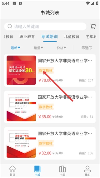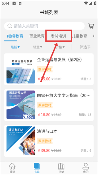 在【书城列表】页面,点击顶部的【考试培训】分类标签,即可切换到对应的类别书籍列表,进而筛选出考试相关的教材。