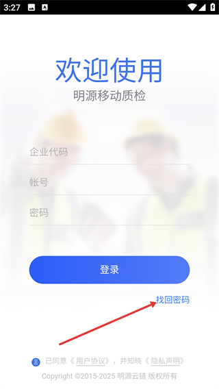 在【明源移动质检】的登录页面,您可以点击【找回密码】选项来进行密码重置操作。