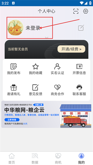 在中华粮网首页点击底部的【我的】按钮,就能进入个人中心页面。