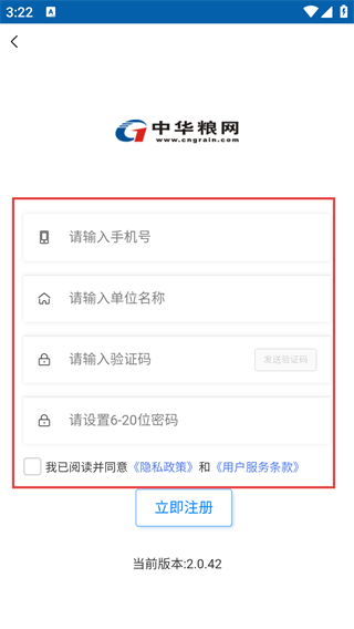 进入新用户注册界面,按顺序填写【手机号码】【单位全称】,获取并填写【验证码】,设置6至20位的密码。