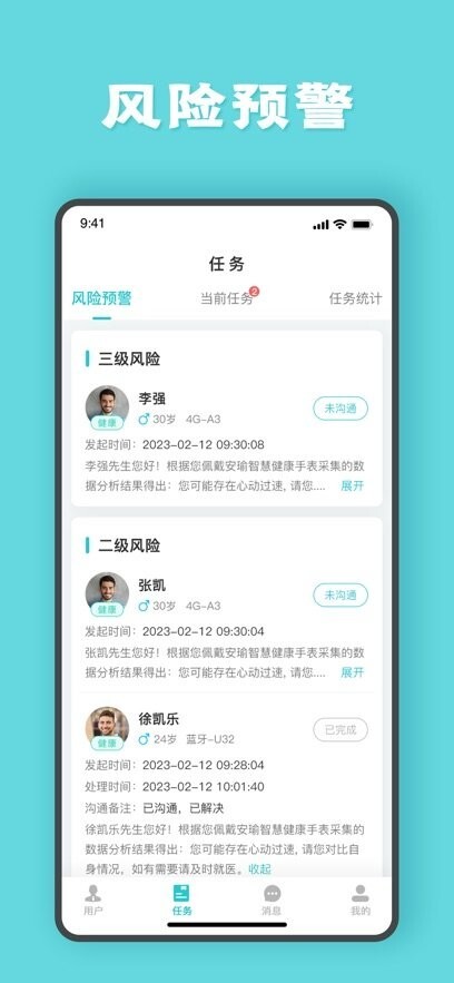 实时监测用户健康状况,第一时间识别健康异常用户并启动一、二、三级风险预警机制;提供用户健康服务数据统计功能,助力健康管理师与医生动态掌握用户健康信息,并结合用户既往病史,制定个性化健康指导方案。