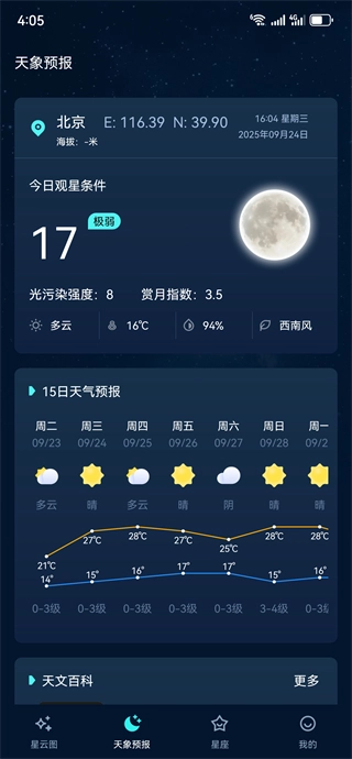 2、除了包含光污染强度、赏月指数等观星核心指标外,还可提供逐小时的天气预报,助力用户更科学地筛选出适宜观星的时间与地点。