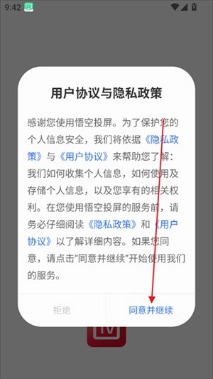 然后点击"同意并继续按钮"完成用户协议的确认。