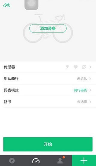 先选择添加装备,接着添加传感器、开启组队骑行功能,再切换到码表模式,等熟悉路线后点击开始按钮。