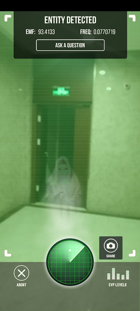 然后可以在你周围光线较暗的入口,比如楼梯间这类可能有鬼出没的地方进行扫描,突然软件就会发出声响,一个幽灵便会闪现到眼前。