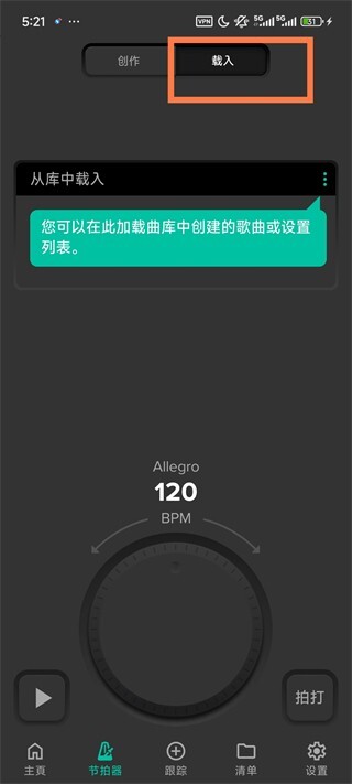 还可以在载入界面加载在库中所创建的歌曲或曲目。